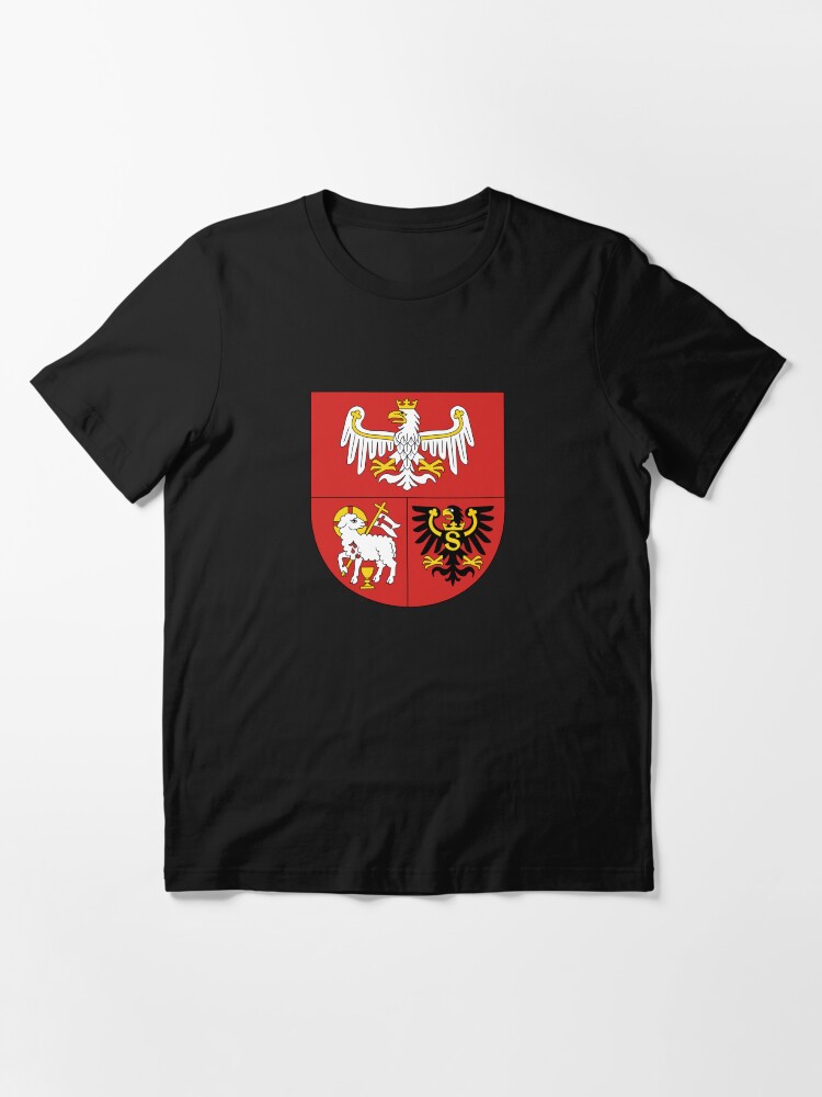The coat of arms of the Warmian–Masurian Voivodeship, Poland consists of a red Iberian style escutcheon (shield) that is divided horizontally into two parts. The top part features a white eagle with a yellow (golden) crown on its head. The bottom part is divided vertically into two fields. The left bottom field depicting a Lamb of God, in a form of a white (silver) sheep with a yellow (golden) circular aureola behind its head, holding in its right hoof, a yellow (golden) cross with a white (silver) banner with red cross on it, attached to it, and bleeding from its chest, with the red drops of blood falling towards a yellow (golden) chalice placed in front of it, between its legs. The right bottom field depicts a black eagle with a yellow (golden) crown put on its neck, and a capital letter S placed on its chest.